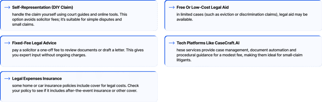 CaseCraft.AI offers a technology‑based alternative. Its platform guides users through each stage of a small claim, from drafting a pre‑action letter to filing court forms and preparing for hearings. By automating document assembly and providing procedural prompts, Casecraft.ai makes self‑representation more accessible. Customers pay a modest fee or a small percentage of their recovered sum, avoiding high solicitor costs and bypassing the limitations of traditional no win, no fee small claims arrangements.