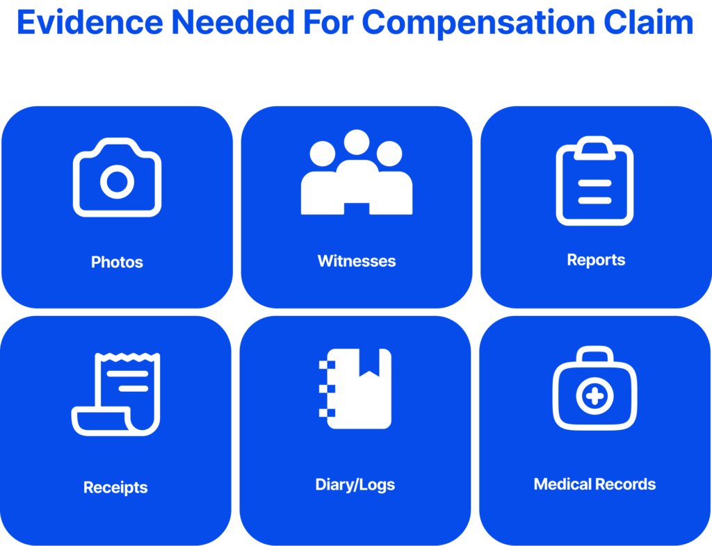Courts rely on medical records, accident reports, photographs and videos, witness statements, and proof of financial loss. A 2025 guide recommends keeping a diary, receipts and payslips. For whiplash claims, a medical examination is mandatory.
