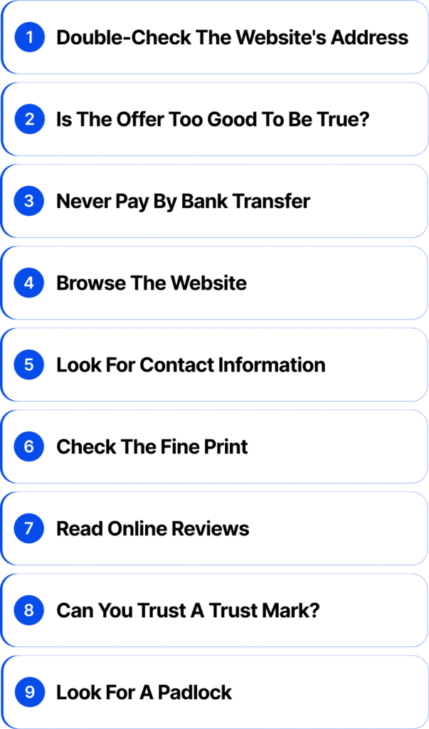 - Be wary of deep discounts. Scam websites use steep discounts and countdowns to get you to “buy now” without scrutiny.