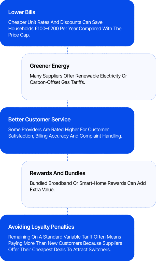 - Lower bills: Competitive tariffs can deliver substantial savings, especially when fixed deals undercut the price cap.