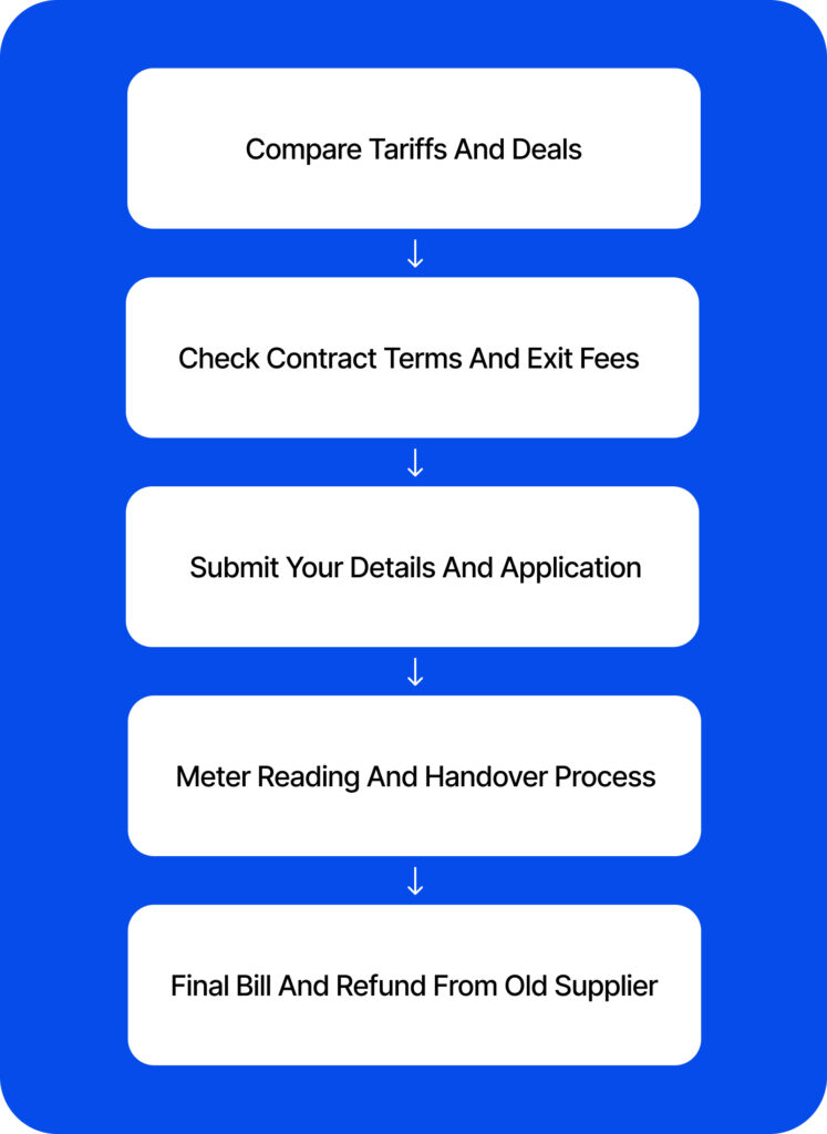 - Meter reading and handover process – On the switch date, send meter readings to both your old and new suppliers. This ensures you are billed accurately. If you have a smart meter, the reading may be taken automatically.