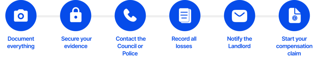 3. Take action quickly – document the incident, contact the council or police, notify your landlord in writing, and, if needed, file a civil claim. CaseCraft.AI automates letters and court documents so you can pursue compensation without legal training.