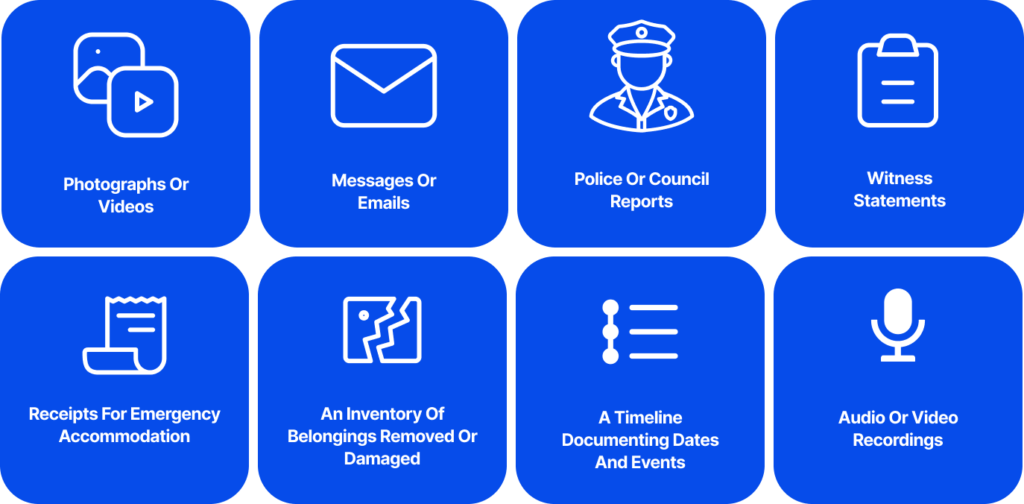 You should gather photos of changed locks, screenshots of messages, police or council reports, hotel receipts, storage costs, and a timeline of events. Witness statements can also help. Digital evidence is accepted by the courts.