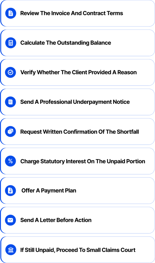 Send a polite reminder first. If no response, issue an Underpayment Notice detailing the invoice, amount received, outstanding balance and deadline for payment. Follow with a Letter Before Action if necessary.