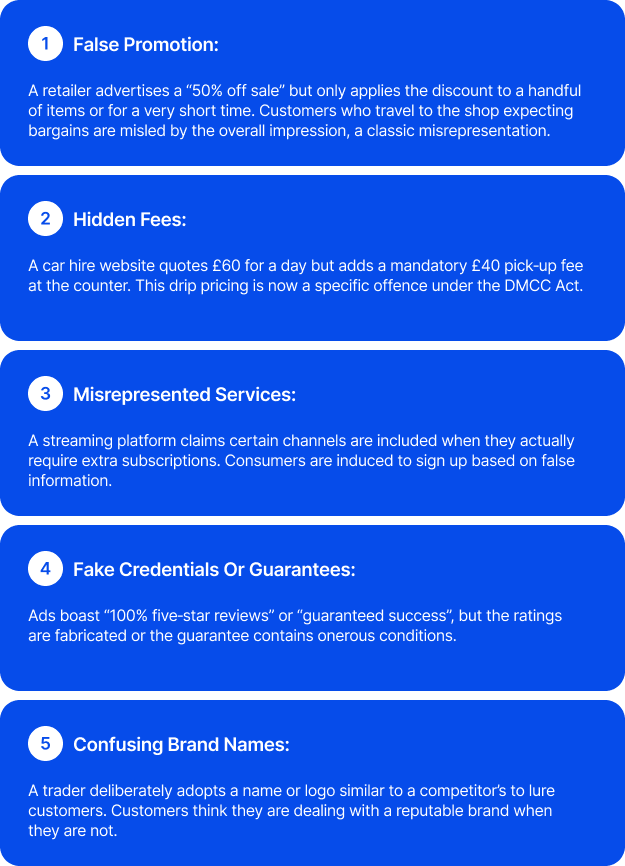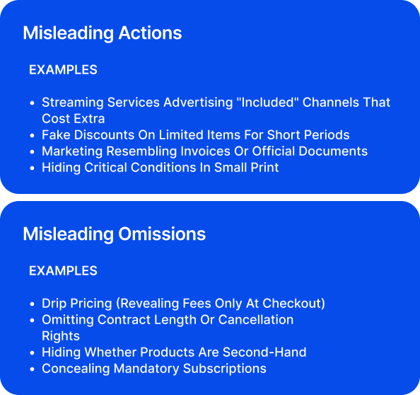 - Misleading actions occur when a trader provides false or misleading information (for example, exaggerating the benefits of a product without evidence), uses deceptive services (such as hiding critical conditions in small print), creates confusion with a competitor’s products or fails to follow a code of conduct to which it claims to adhere. Examples in the DMCC guidance include a streaming service advertising that certain channels are included in a “premium” package when they actually cost extra, or a retailer promoting “discounts” that only apply to a handful of items for a short time. Marketing that resembles invoices or uses an official‑looking logo can also mislead.