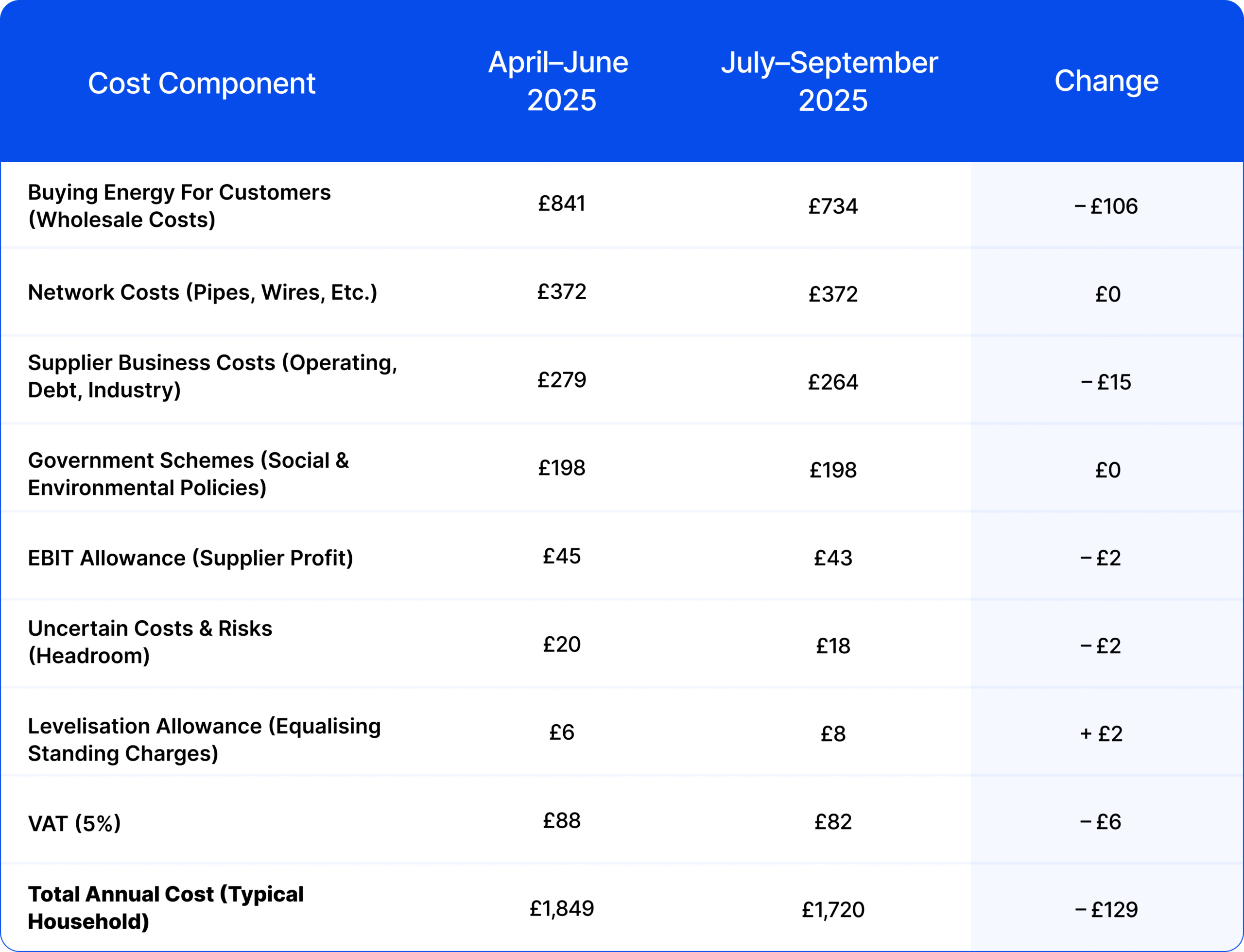 Source: Ofgem, “Summary of changes to energy price cap, Cap period 14b (1 Jul–30 Sep 2025)”.