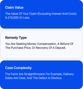 - Claim Value. The value of your claim (excluding interest and costs) is £10,000 or less.