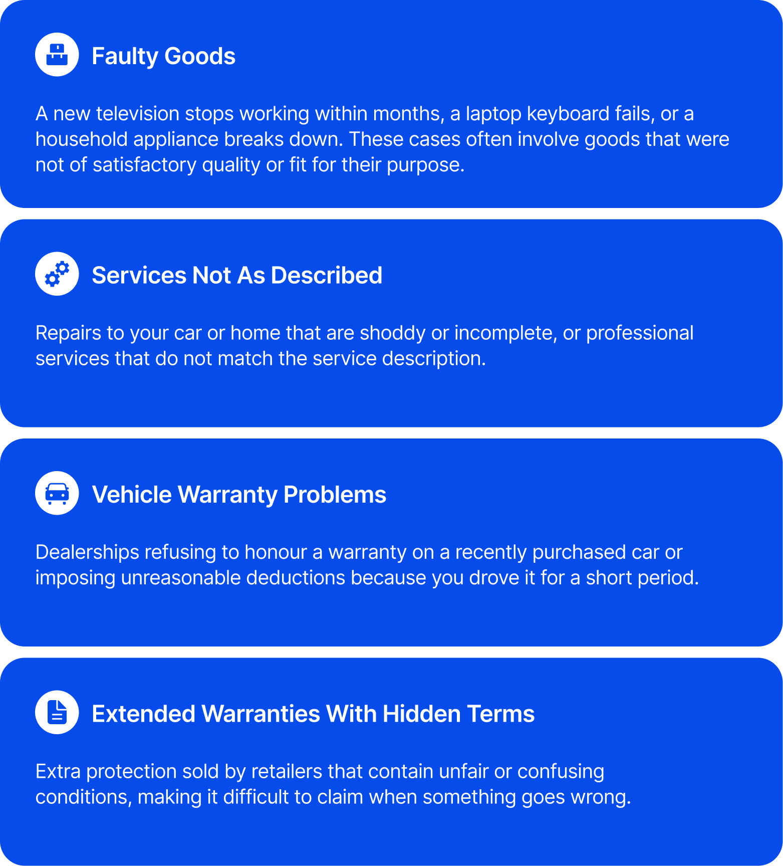 When you buy goods or services in the UK, you enter a contract with the retailer, and there may also be a manufacturer’s warranty, a product guarantee, or an extended warranty. A warranty dispute arises when the product or service fails to meet the standards you were promised, and the seller or manufacturer refuses to repair, replace or refund it. Common situations include: