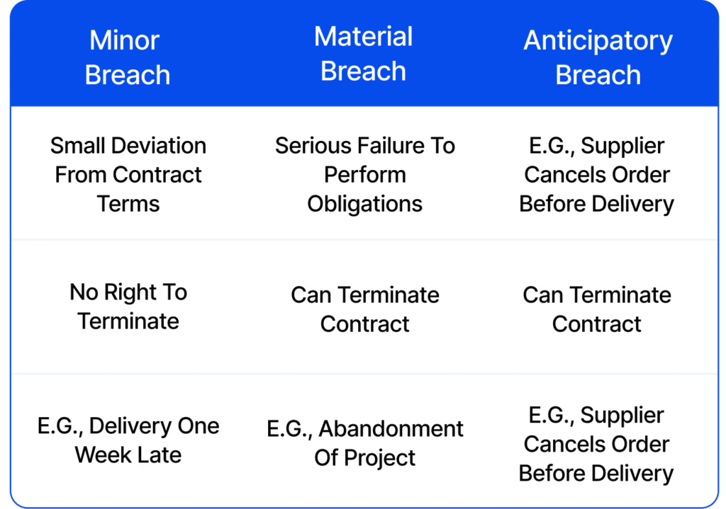 Not all breaches are equal. Understanding the types of breach of contract helps you assess the seriousness of the failure and the remedies available. In English law, breaches are generally categorised as minor (partial), material or fundamental, anticipatory, and actual. Each has different consequences. The chart below visually compares these types: