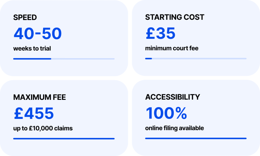 - Speed. While county courts can be slow, small claims cases now reach trial in around 40–50 weeks, much faster than other tracks.